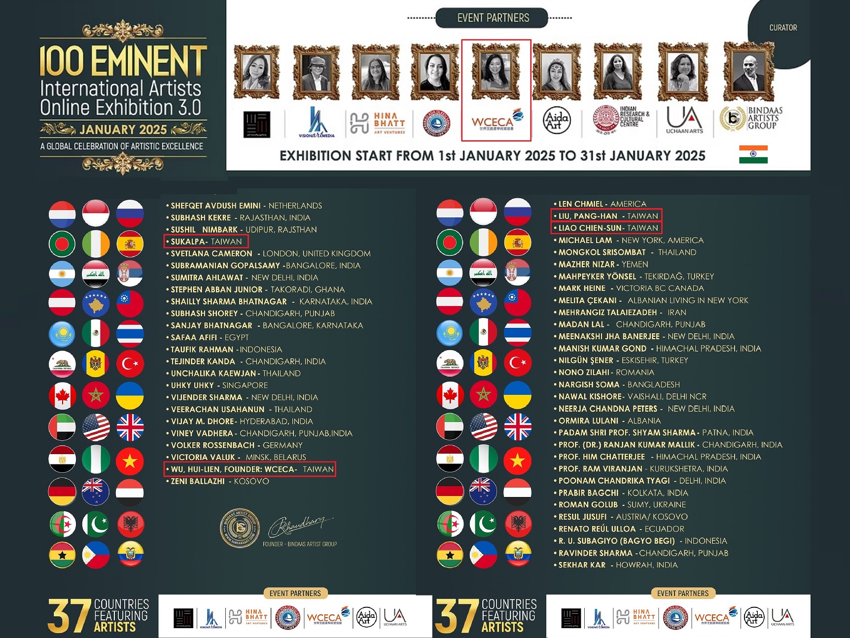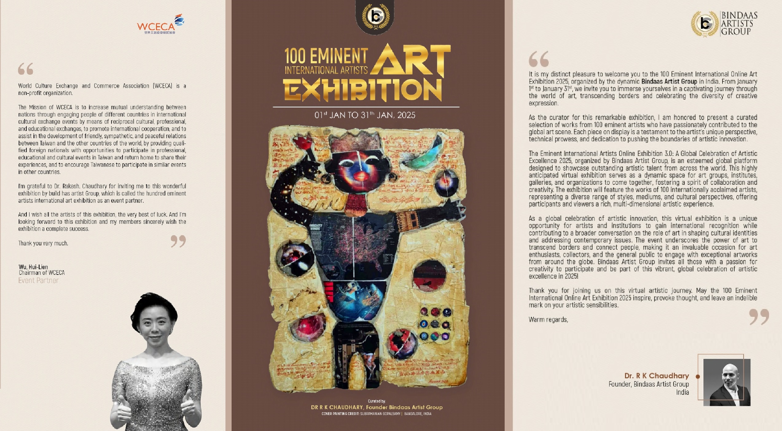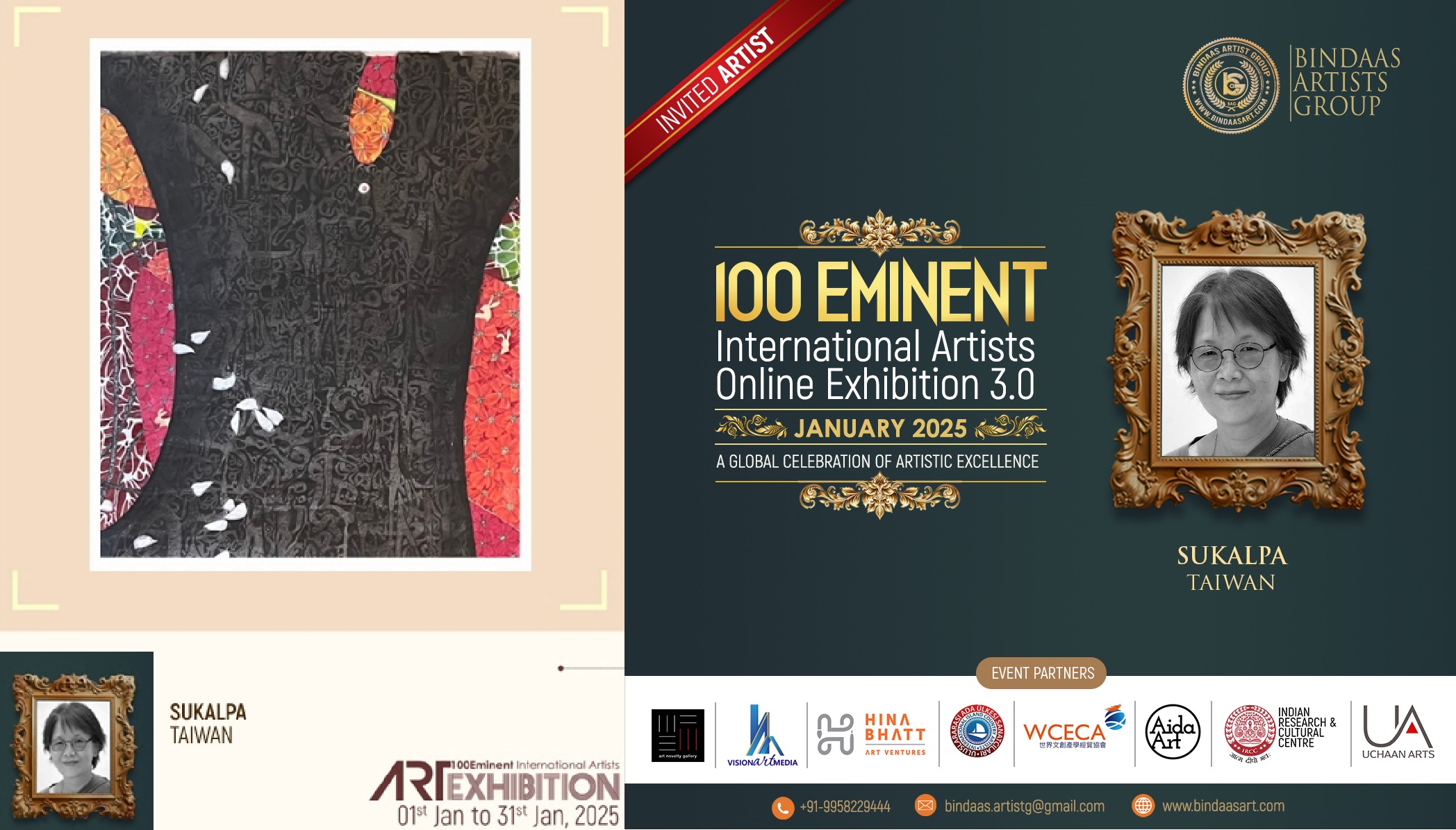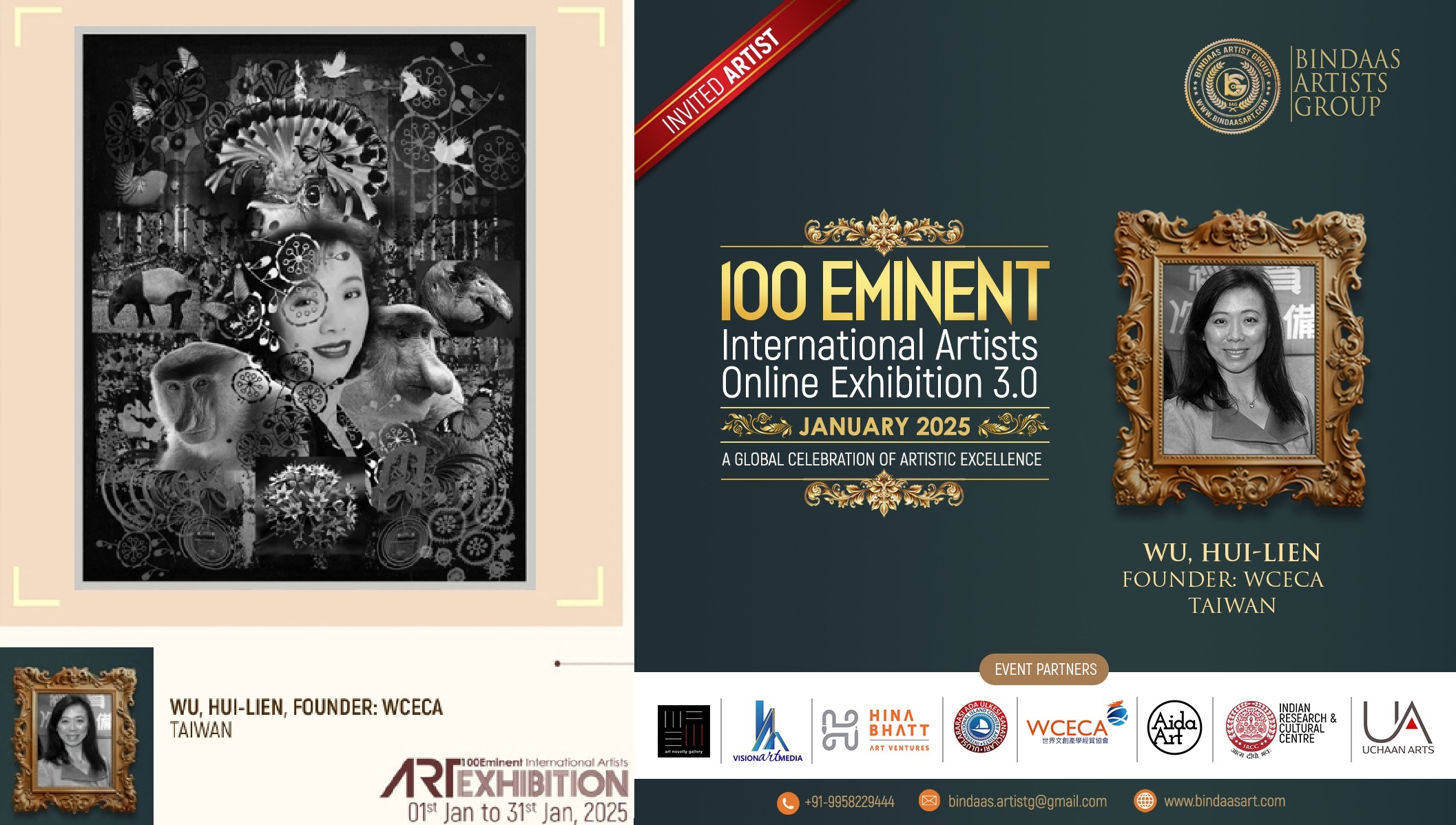 來自台灣知名國際策展人藝術家吳慧蓮主席,現就讀於台灣玄奘大學藝術設計學院碩士班,連續四年受邀擔任本展活動合辦人及由吳理事長領導的「世界文創產學經貿協會」(World Culture Exchange & Commerce Association, WCECA)與E郵報、國際聯合報社、八方新聞等媒體作為本展的合辦單位,積極推廣台灣藝術與文化領域,擴展全球網絡協作、品牌力量與資源共享,放大國際能見度,深化台印兩國合作交流與友誼。吳老師持續性地支持及推動聯合國17項永續發展目標(SDGs, Sustainable Development Goals),本屆參展作品為版畫(100×100公分)《守護地球•搶救瀕危動物》(Save the Earth–Save the Endangered Species!),以呼籲這些動物面臨棲息地破壞、非法狩獵、寵物貿易、污染、氣候變遷等威脅,例如台灣的石虎、黑熊、穿山甲,以及全球的亞洲象、馬來貘、無尾熊等,需要各級政府與民眾共同採取保育行動。她現任「世界和平大使」、「世界文創產學經貿協會」理事長、「環球小金人®」(Global Golden Statuette®)百大名家主席、e郵報(Ewnews)及國際聯合報社(IAP)等媒體社長,長期致力於推動全球文化交流、創意產業發展、科技教育與推動台灣影視產業。吳慧蓮(Anasha)舉辦活動跨足歐、亞、美三大洲。