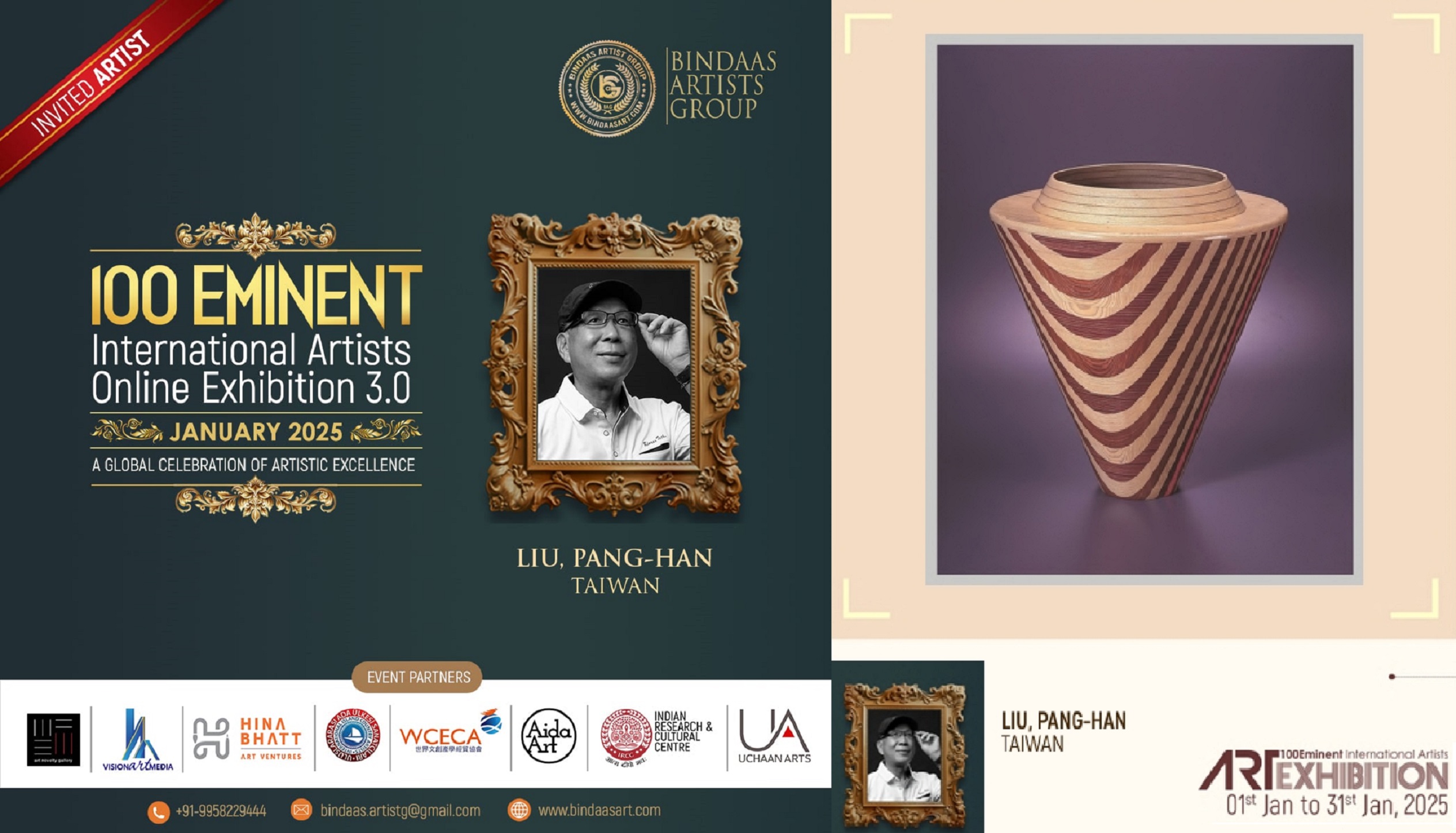 「2025百大卓越國際藝術家線上展 3.0」全程架設於Bindaas專屬線上虛擬平台並製作線上畫冊,允許來自世界各地的參與者及觀眾無地域無時間阻隔,均可自由參與欣賞。2025年度線上展覽自元月一日起至年底,歡迎海內外民眾共襄盛舉。EMINENT ARTIST’S ART EXHIBITION 網站:https://www.bindaasart.com/copy-of-eminents-artists。