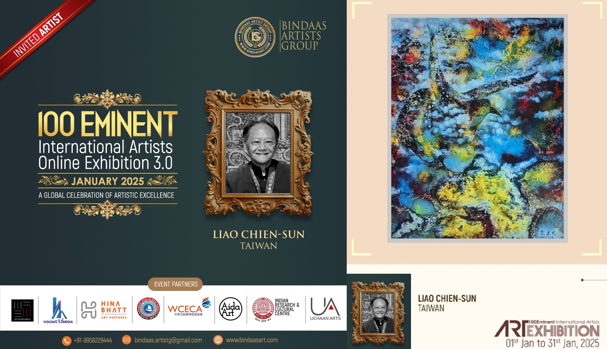 【記者 李力安 印度報導】台灣傑出藝術家吳慧蓮、劉邦漢、張素蘭、廖建順博士、張嘉苓博士獲邀參加「印度賓達斯藝術集團」(Bindaas Artist Group, India)舉辦「2025百大卓越國際藝術家線上展 3.0」(The Eminent International Artists Online Exhibition 3.0),由拉克什·庫馬爾·喬杜里博士(Dr. Rakesh Kumar Chaudhary)創辦,2022年起舉辦全球藝術卓越慶典(A Global Celebration of Artistic Excellence),號召藝術團體、機構、畫廊及組織參與極具聲望的線上盛會,以表彰來自世界各地傑出藝術人才與其作品,截至目前已有數百位知名卓越國際藝術家參與,線上觀展者破萬人次,獲業界高度肯定。2025年作品涵蓋更多樣的創作風格、媒材和文化視角,全球共計100位國際知名藝術家受邀,BAG為參與者、收藏家和觀眾提供豐富多維的藝術空間,共同見證這場全球藝術創意的盛會。