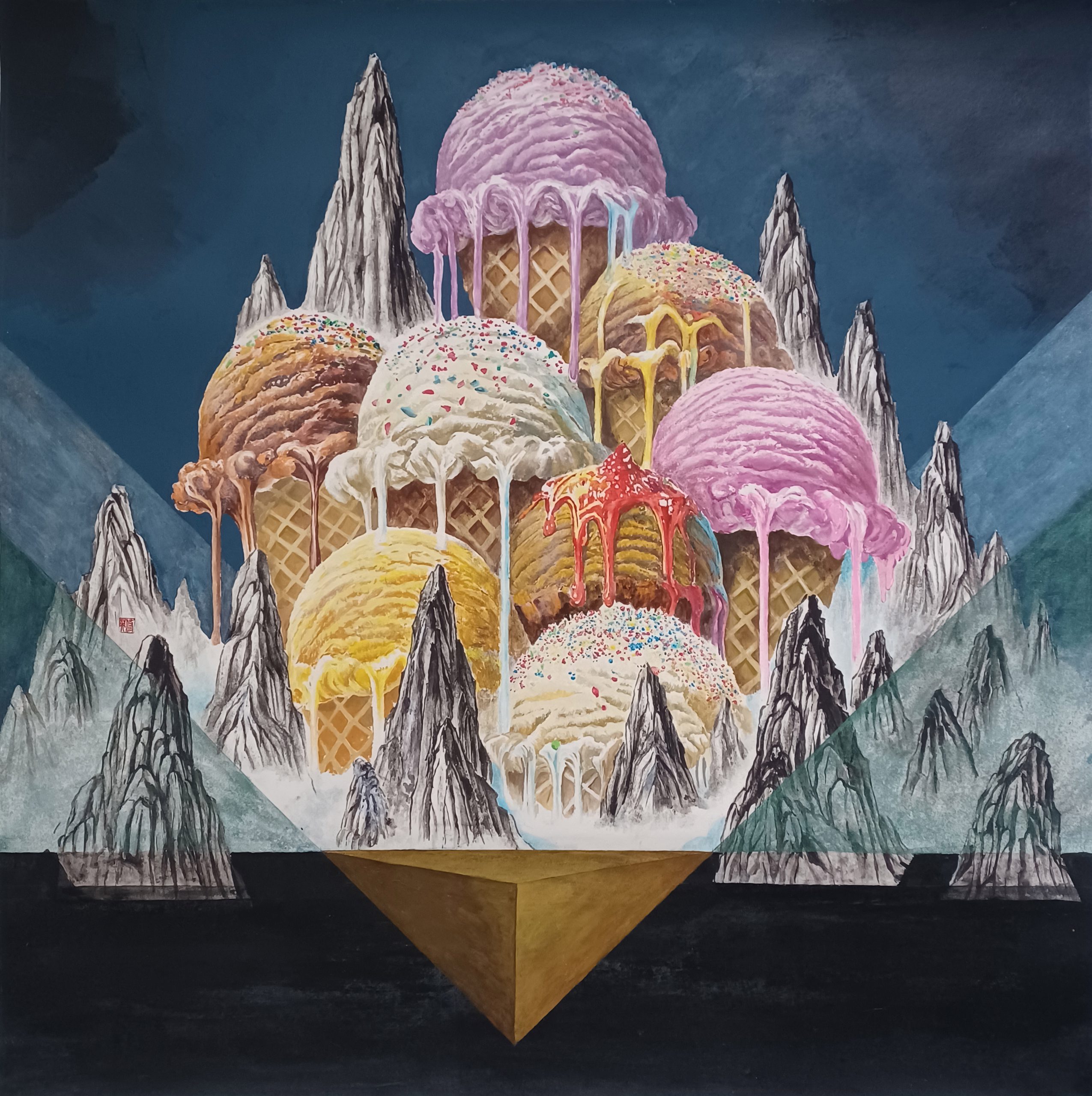 作品以古代山水為基調,結合現代冰淇淋的造型,形成一種時空錯置的對望。山象徵恆久與自然的精神,冰淇淋則代表當代生活的感官享受與瞬息即逝的甜美。兩者之間的凝視,既像古今文化的對話,也隱喻記憶與時間的流動。我希望藉由這樣的異質並置,喚起觀者對「傳統」與「現代」關係的再思考——當我們在快速變遷的時代中追求感官愉悅,是否也在不知不覺中讓歷史與文化逐漸融化?透過筆墨層次與形式轉化,我嘗試讓山與冰淇淋在畫面中達成一種微妙的平衡,展現東方審美在當代語境下的延續與轉化。