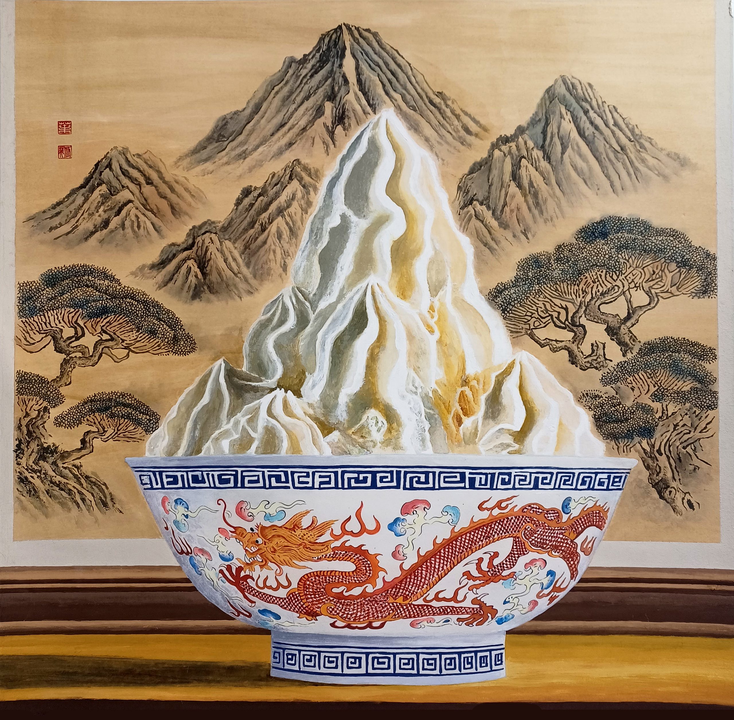 作品〈山味〉以傳統山水畫筆法描繪古山,並將造型似山的冰淇淋置於碗中,形成古與今的對望。畫面結合東方山水的筆墨意境與現代日常的符號語彙,展現異質並置的幽默與詩意。透過水墨層次與細膩的形體轉換,藝術家嘗試讓觀者在熟悉與陌生之間產生新的視覺感受。