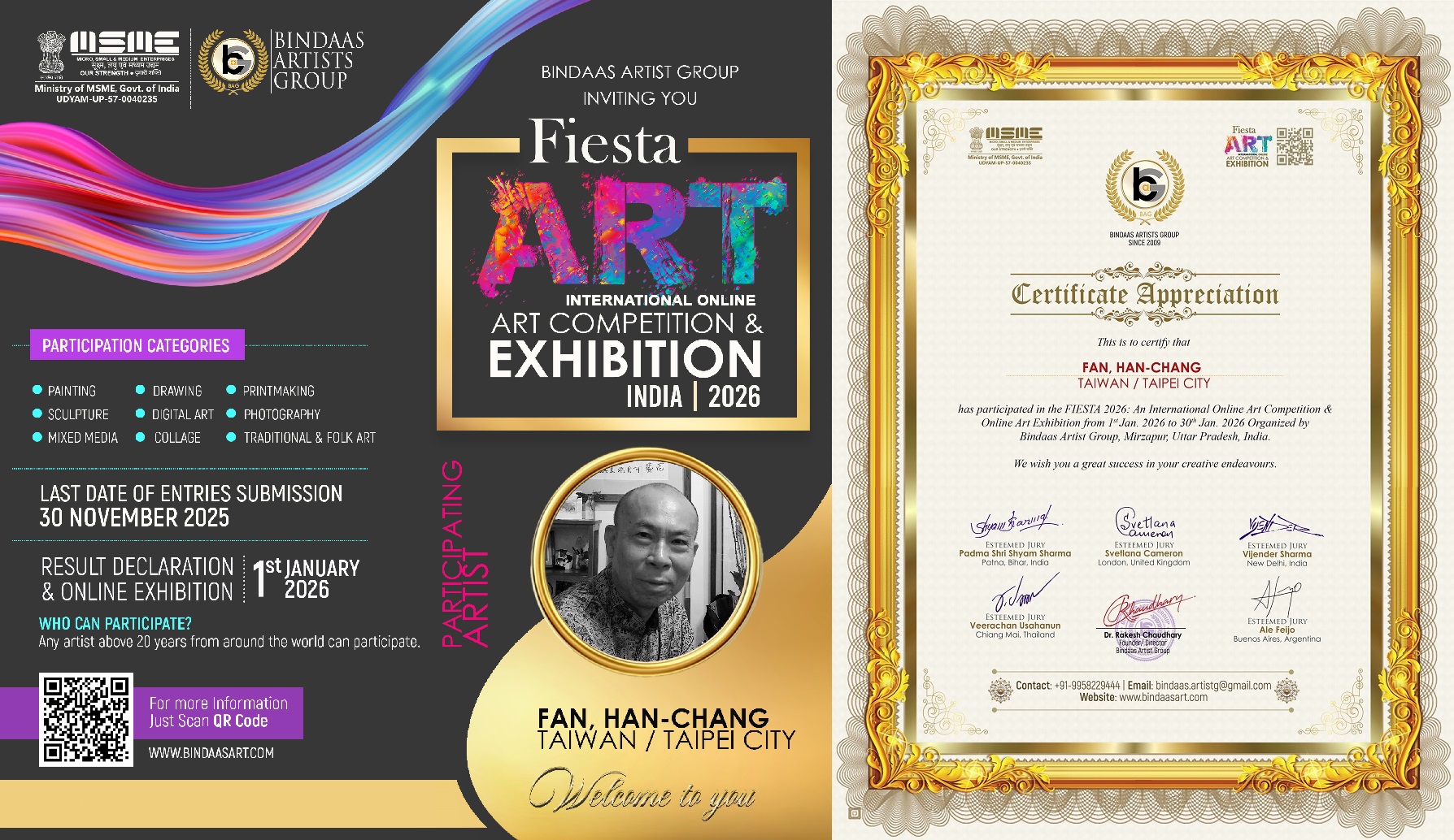 一場關於靈魂幻化的「完形」實驗,將大自然的原始能量轉化為高度純粹的意象美學語彙,以極為罕見的「視覺發現(Visual Discovery)」能力,從混亂的自然界中,精準辨識出具有東方文化意象的幾何結構,成功完成了從「紀錄者」到「美學創作者」的身份跨越。台灣攝影藝術名家房漢樟(Fan, Han-Chang,人稱「房大人」)憑藉其震撼力作〈千年之約的傳奇─龍鳳呈祥〉(Legend of the Millennium Bond – Auspicious Dragon and Phoenix)(攝影作品,44 × 80 cm,2017年),在「2026 國際慶典藝術大賽暨線上展覽」(2026 International Fiesta Art Competition & Online Exhibition)眾多攝影作品中脫穎而出,入選佳作。印度知名策展團隊「賓達斯藝術集團」(Bindaas Artist Group)創辦人暨本大賽策展人拉克什・庫馬爾・喬杜里博士(Dr. Rakesh Kumar Chaudhary)及評審團一致肯定其技術精準,更表彰其思想深度:當西方觀者凝視尼加拉瀑布(Niagara Falls),其水霧在極短的快門瞬時中凝結,將奔騰水流轉譯為龍鳳交織的靈性符碼,捕捉到東方神話的剎那幻化。水花與煙氤不再僅是地理性的物理現象,而是因完形結構而浮現龍鳳意象,這使觀者得以思考自然與神話的交匯。這種「隱喻式」的觀看方式,正與美國攝影大師邁納·懷特(Minor White)所言的「等值論(Equivalence)」精神,當代演繹高度契合—影像喚醒觀者內在圖像,超越語言藩籬。在當代影像分析中,房漢樟的作品是應用心理學「完形結構(Gestalt)」的經典案例。