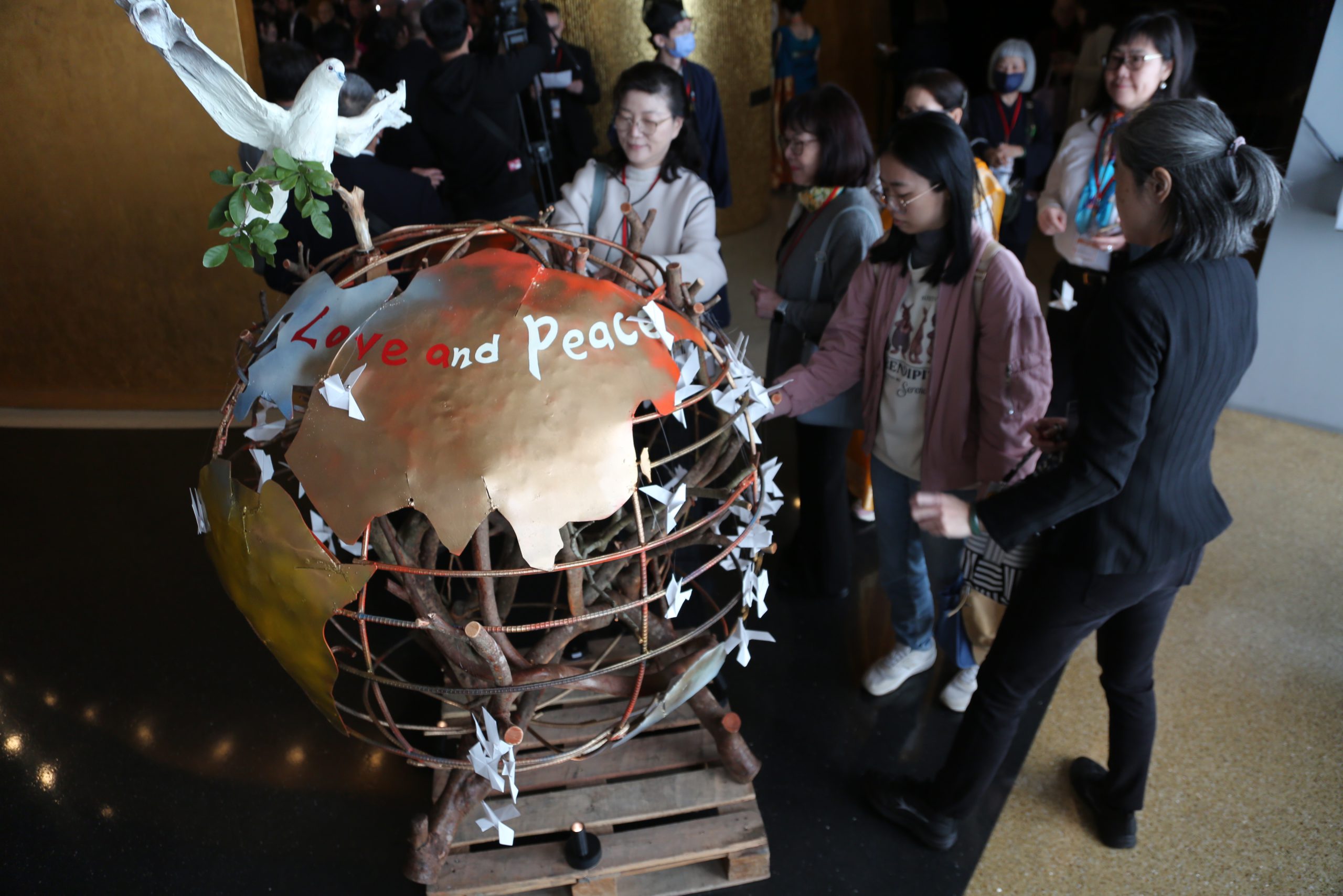 活動高潮是在金色大廳旁玻璃牆舉行的「和平鴿遙送祈願儀式」。跟著天主教聖嘉祿兄弟會安吉恩神父(Fr. Emanuele Angiola)的福音,參與者將象徵祝福的紙鴿,掛置於藝術家王偉權全新創作的漂流木地球裝置上,祈願心聲隨之傳遞至世界各個角落。隨後在聖方濟《太陽歌》樂音中,藉由音聲的力量凝聚善念,形塑跨世代的靈性共鳴。