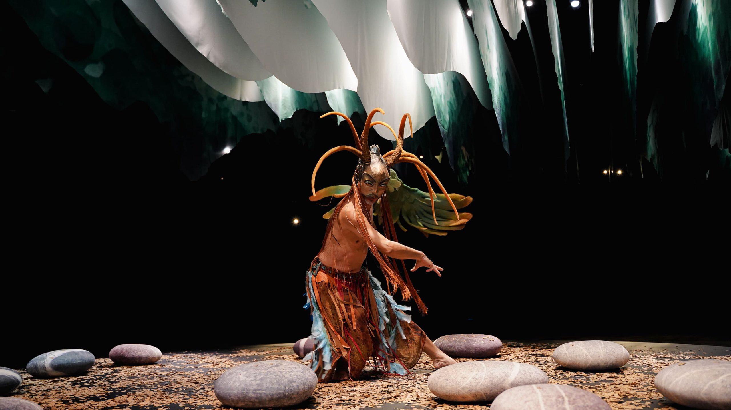 張忘戴著混合羊頭與魚頭的面具,左手是大鳥的羽翼,化身他想像的古老玄鳥,宛如大自然的信使飛到人間,就像引路者一般,帶領觀眾穿越迷霧,回到「山海天人」的奇妙天地,走過「潛行海洋、靜觀山川、穿越天穹」3個主題展區,透過互動式的表演,期盼大家謙卑對待我們身處的自然環境,寓意深遠。