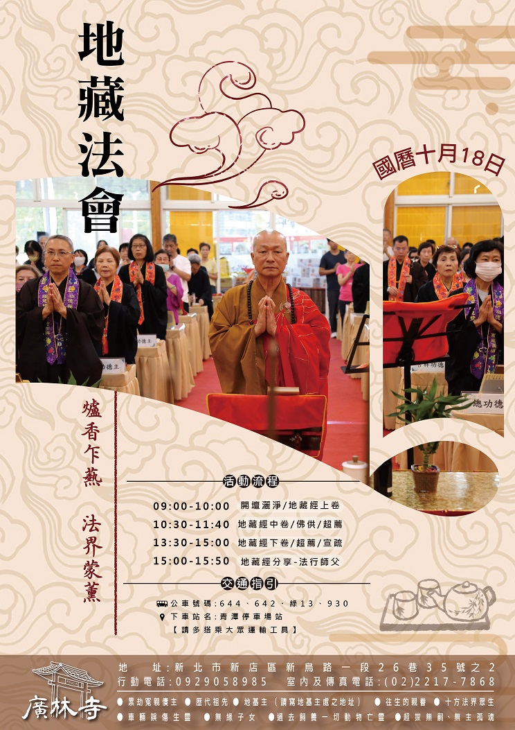 新店廣林寺10月18日舉辦「地藏法會」邀請信眾共修「因緣」