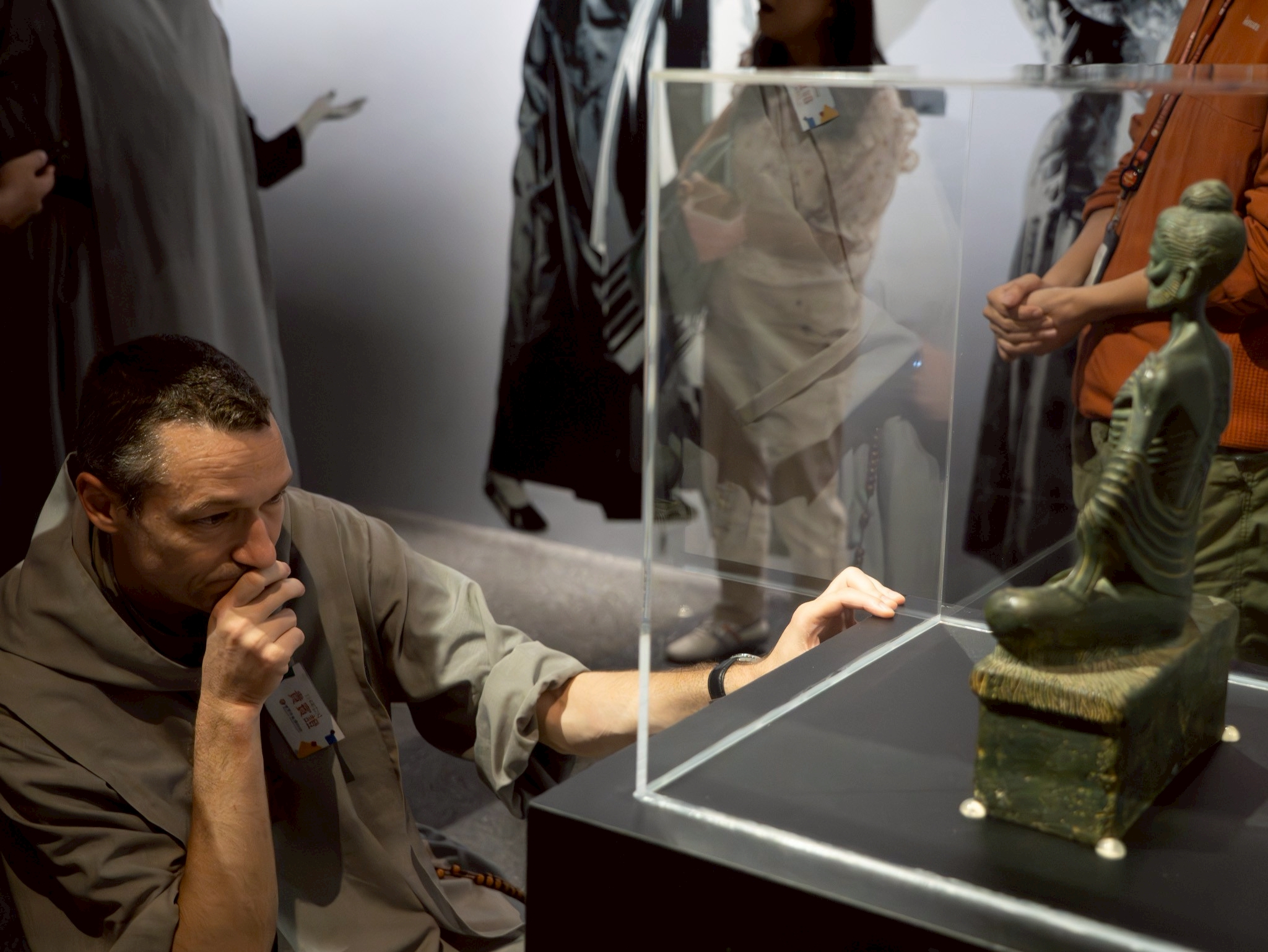 來自台南菁寮聖十字架天主堂的呂天恩神父,曾與宗博館合作推出《宗教建築之美:菁寮聖十字架天主堂》特展,也在11月9日與多位神父、修道士前來參訪。這群天主教神職人員為了《文物開窗系列特展:成為你自己的光》而來,展開基督宗教信仰與佛教世界的深度對話。