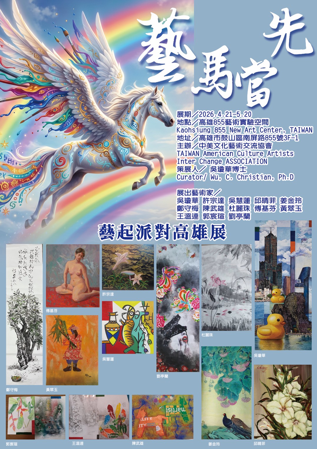在南春意盎然的四月,一場匯聚國際視野與在地情懷的藝術盛事即將在高雄正式拉開帷幕。由策展人吳瓊華博士(Wu, C. Christian, Ph.D.)統籌策劃,中美文化藝術交流協會(Taiwan American Culture Artists Inter Change Association)主辦的「藝馬當先—藝起派對」高雄展,將於2026年4月21日至5月20日,在高雄855藝術實驗空間(Kaohsiung 855 New Art Center)隆重登場。本次展覽以「藝馬當先」為核心意象,結合奔騰、啟程與跨界融合的象徵,呼應當代藝術在全球文化流動中的前行姿態。吳博士表示,此展不僅是藝術家們創意火花的碰撞,更是一種文化能量的釋放與交流,透過多元媒材與風格的交織,呈現藝術家們對當代社會、自然意象與內在精神的深層回應。